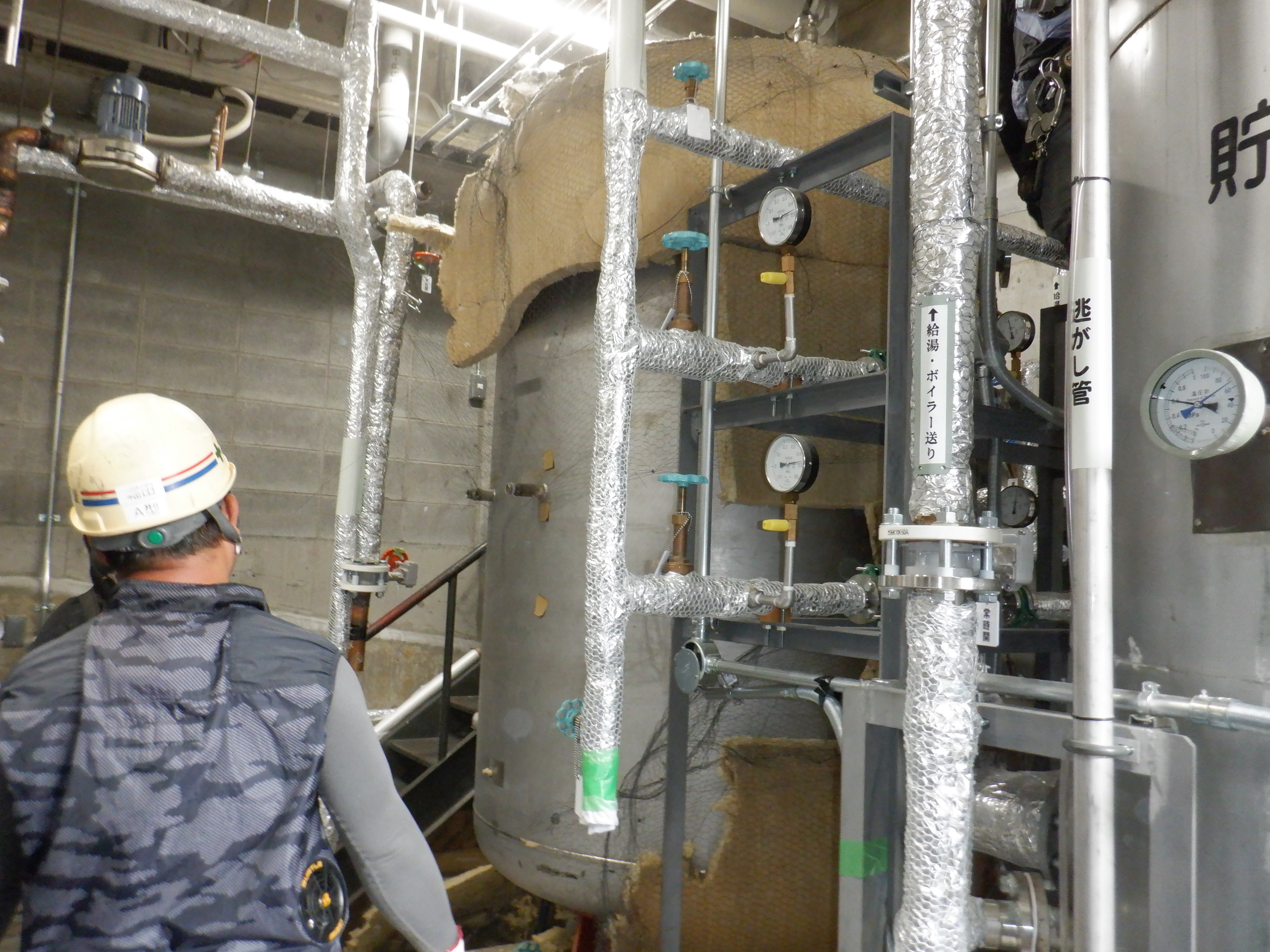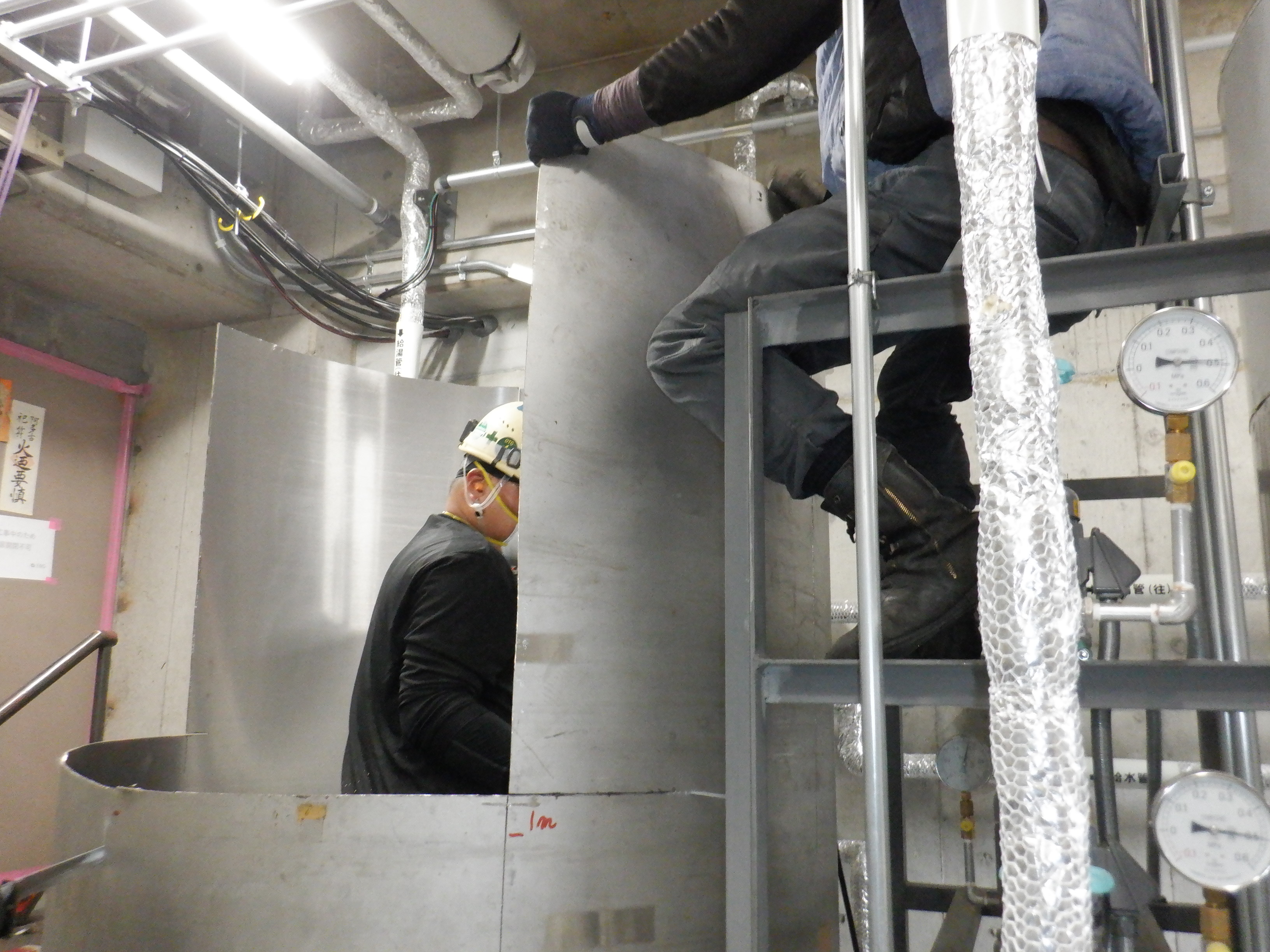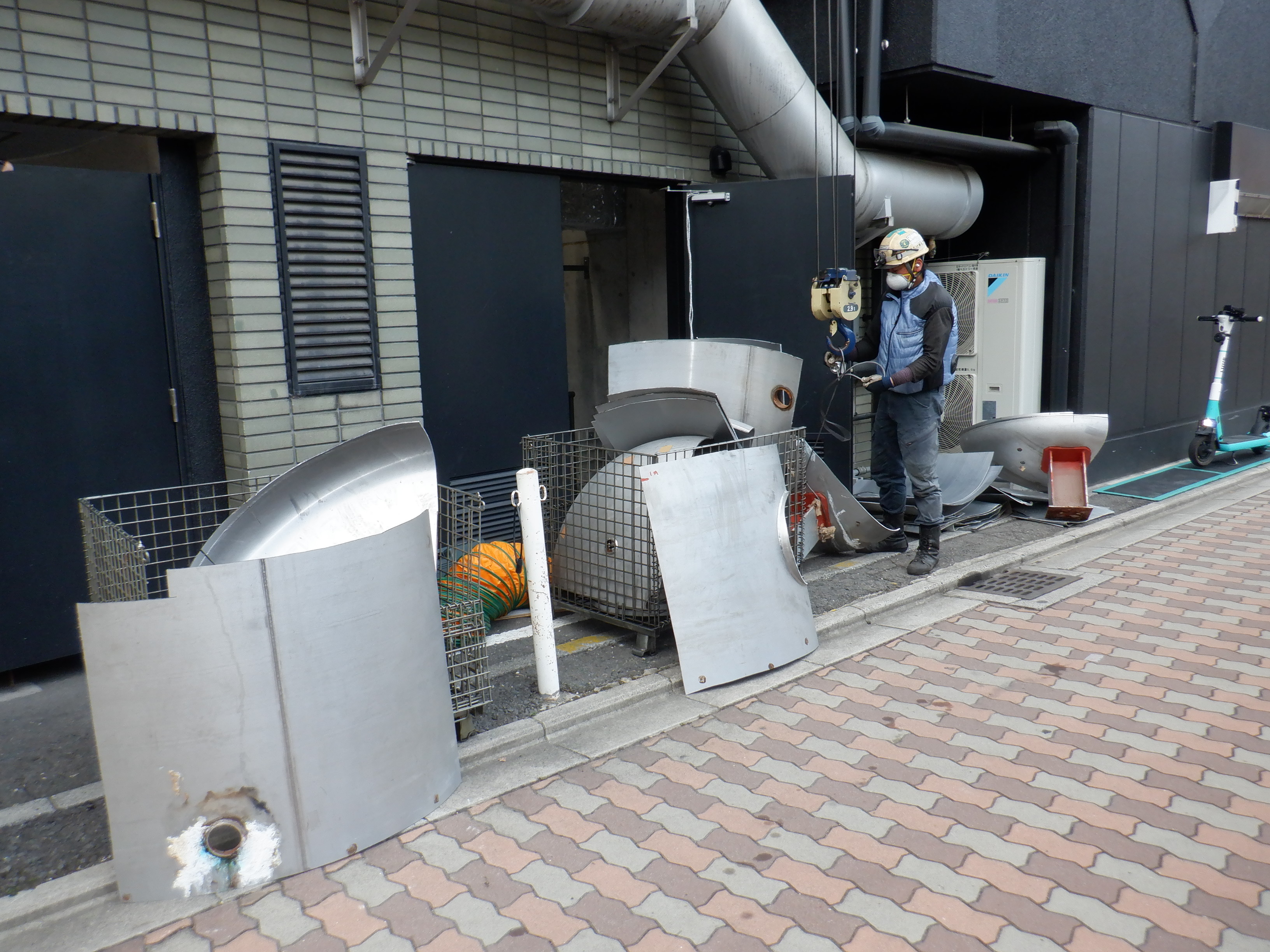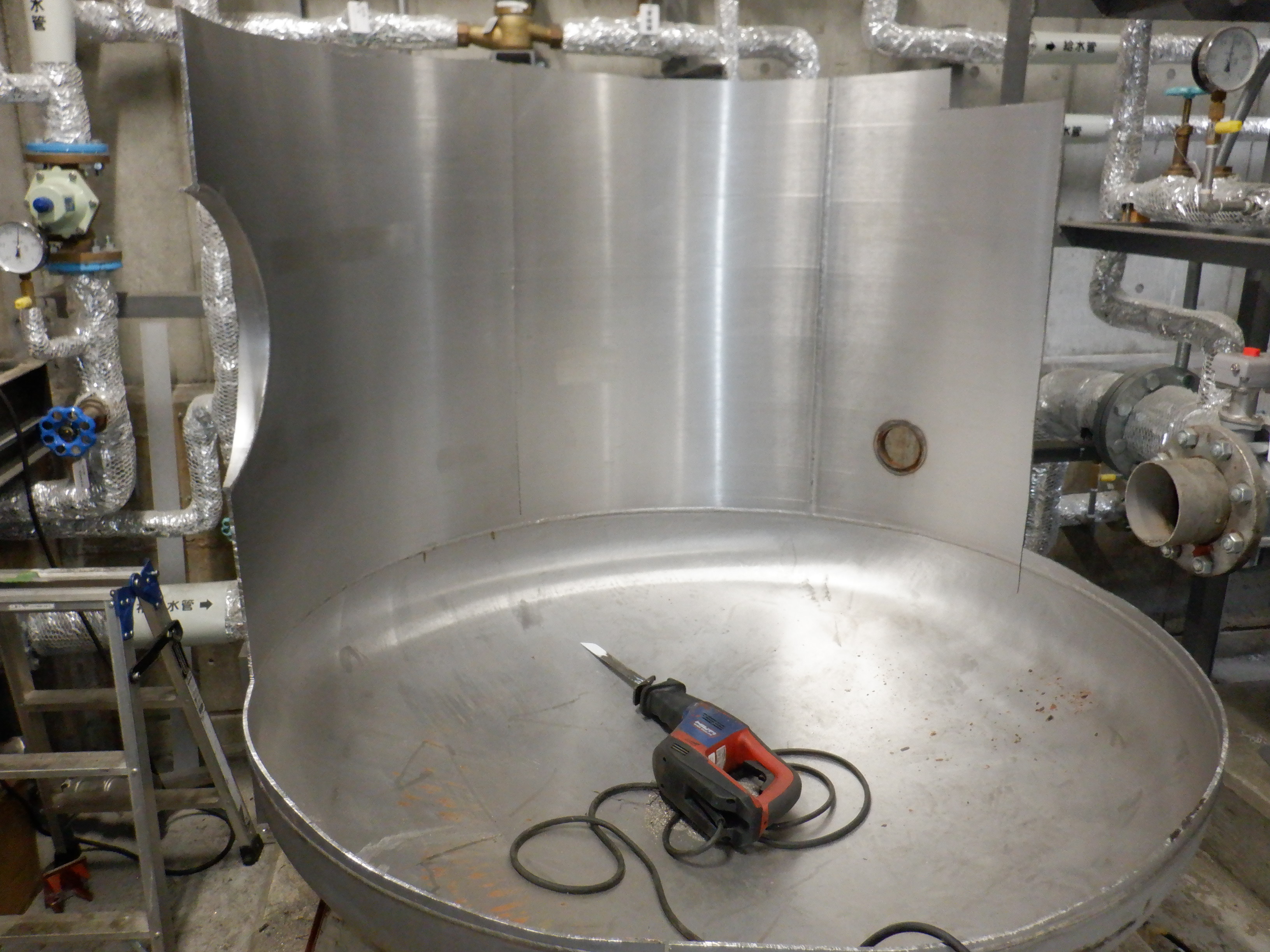 貯湯槽入替の撤去日。サイズ大きいためカットしての撤去。