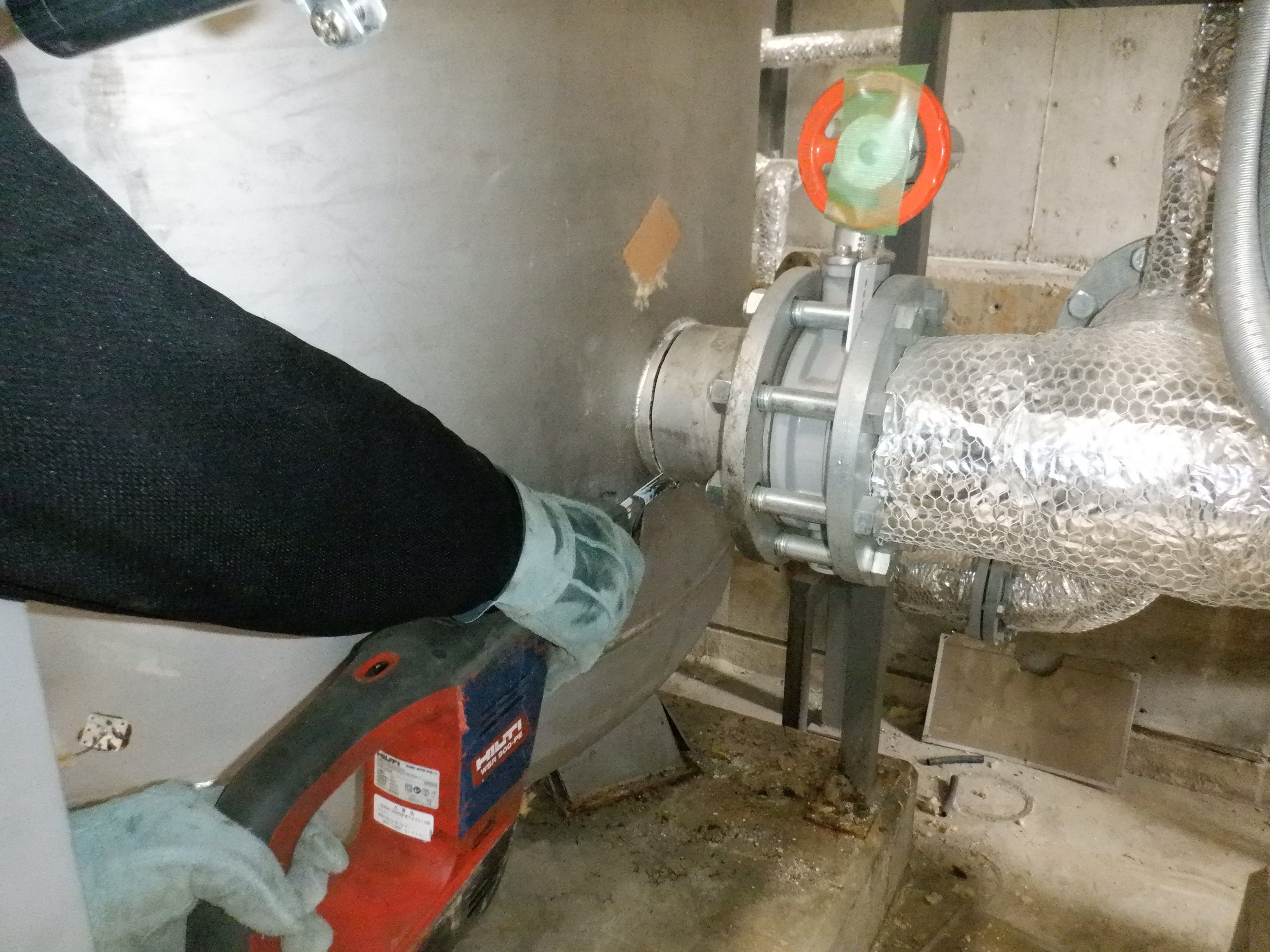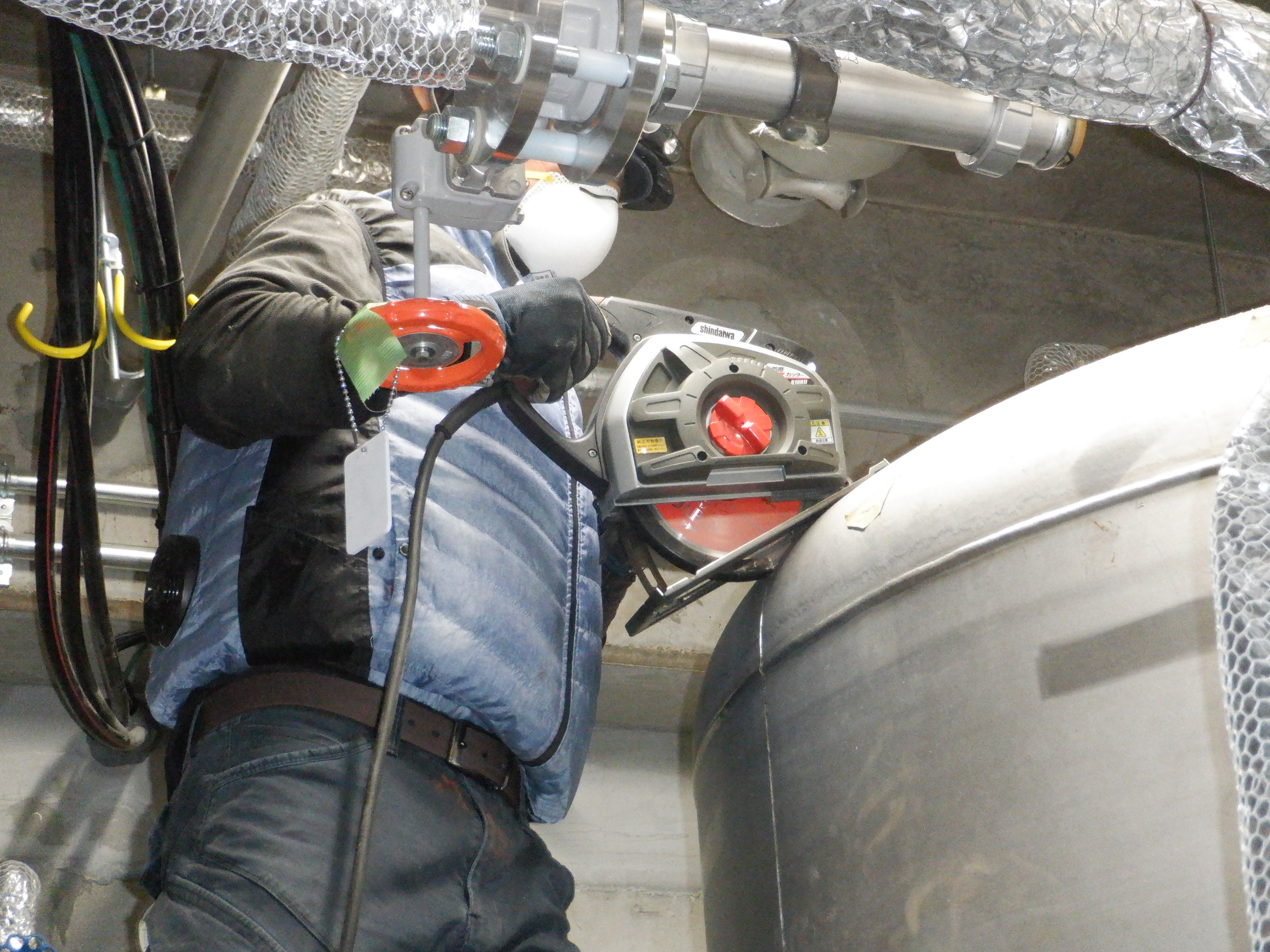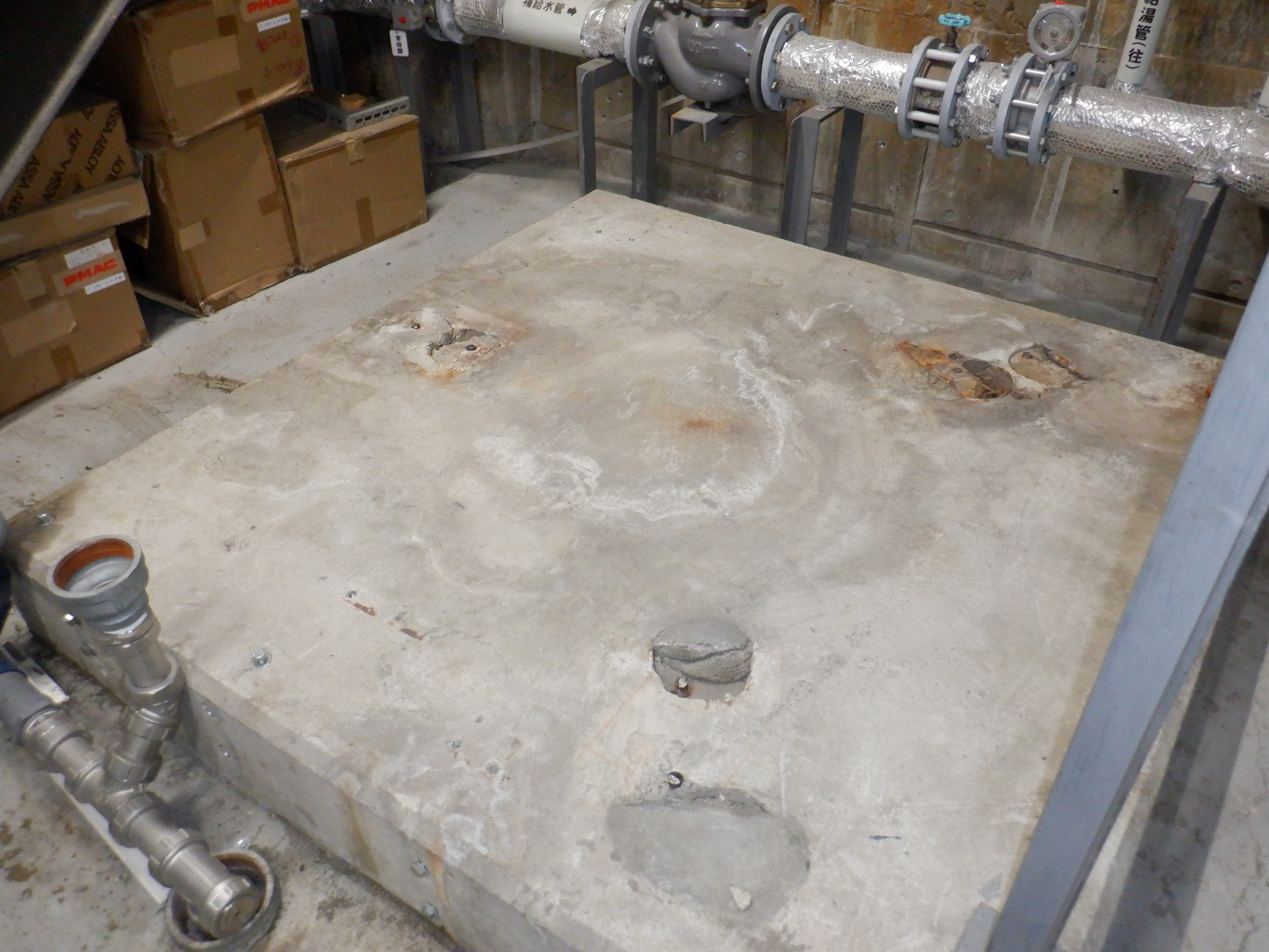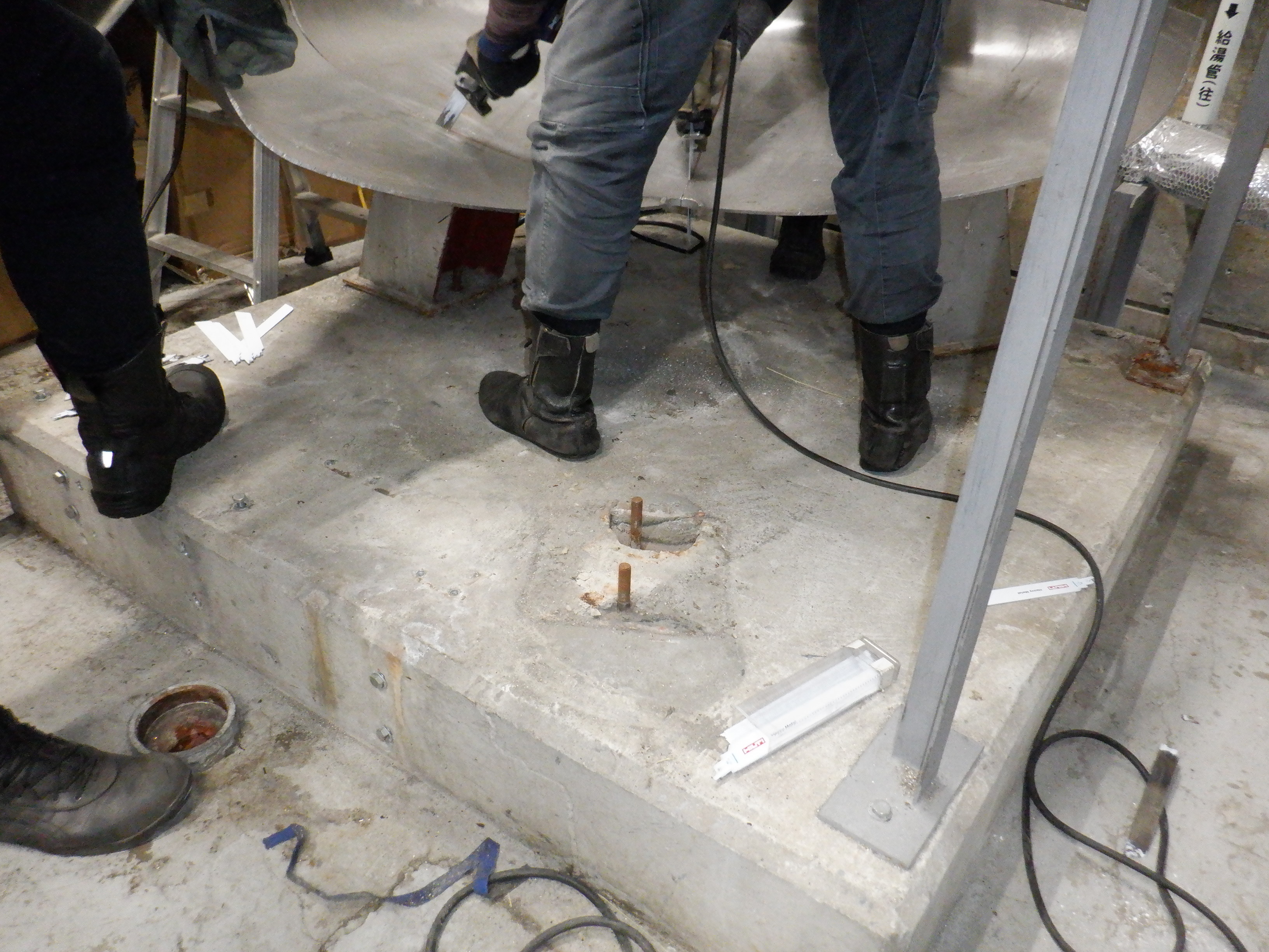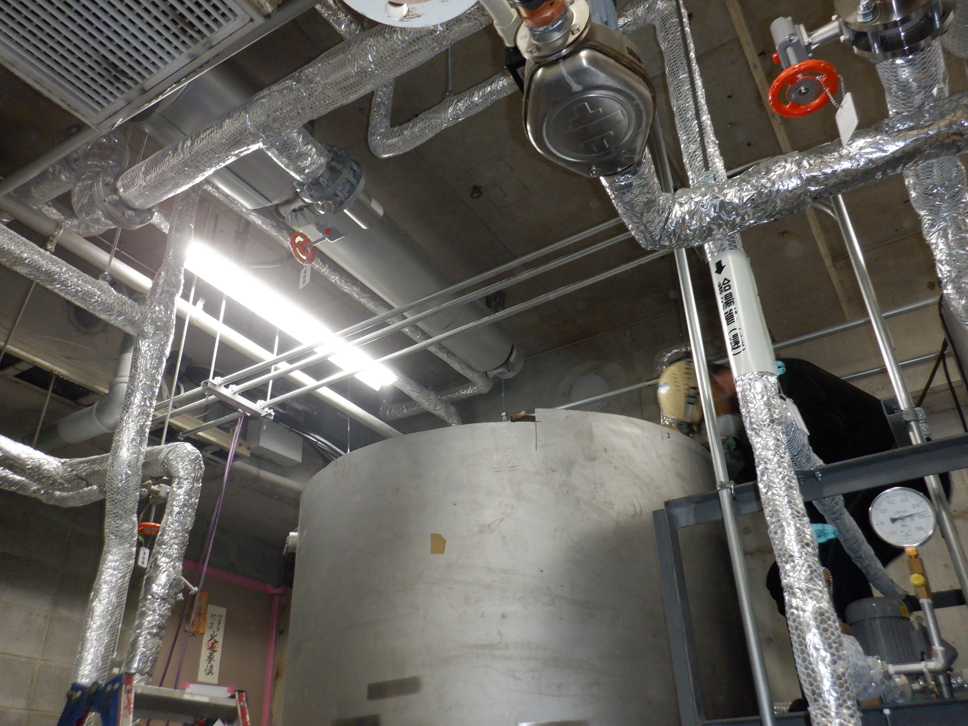 貯湯槽入替の撤去日。サイズ大きいためカットしての撤去。